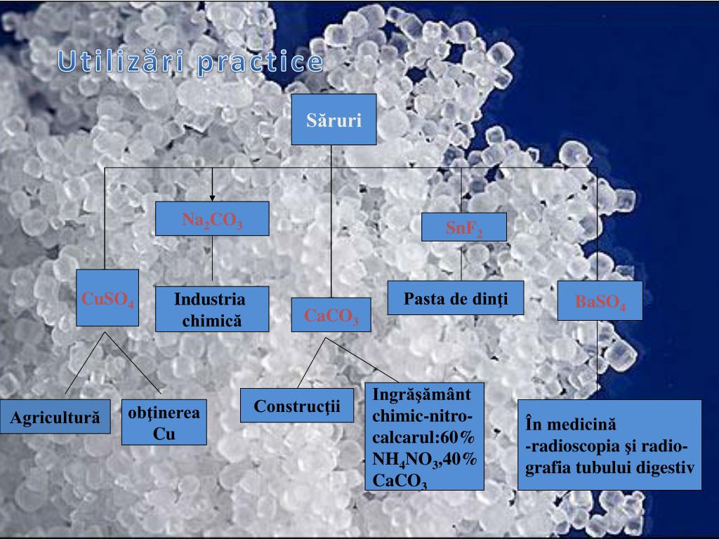 Utilizări practice Săruri Na2CO3 SnF2 CuSO4 Pasta de dinţi BaSO4 Industria chimică CaCO3 Ingrăşământ chimic-nitro- calcarul:60% NH4NO3,40% CaCO3 Construcţii Agricultură obţinerea Cu În medicină -radioscopia şi radio- grafia tubului digestiv