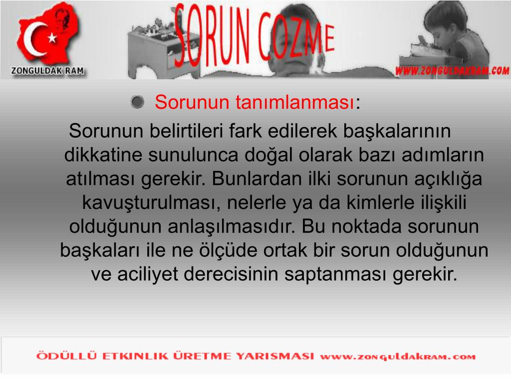 Sorunun tanımlanması: Sorunun belirtileri fark edilerek başkalarının dikkatine sunulunca doğal olarak bazı adımların atılması gerekir. Bunlardan ilki sorunun açıklığa kavuşturulması, nelerle ya da kimlerle ilişkili olduğunun anlaşılmasıdır. Bu noktada sorunun başkaları ile ne ölçüde ortak bir sorun olduğunun ve aciliyet derecisinin saptanması gerekir.