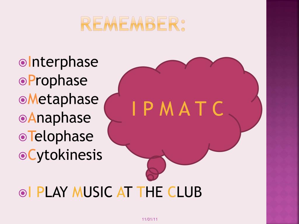 REMEMBER: • Interphase • Prophase • Metaphase • Anaphase • Telophase • Cytokinesis • IPLAY MUSIC AT THE CLUB I P M A T C
