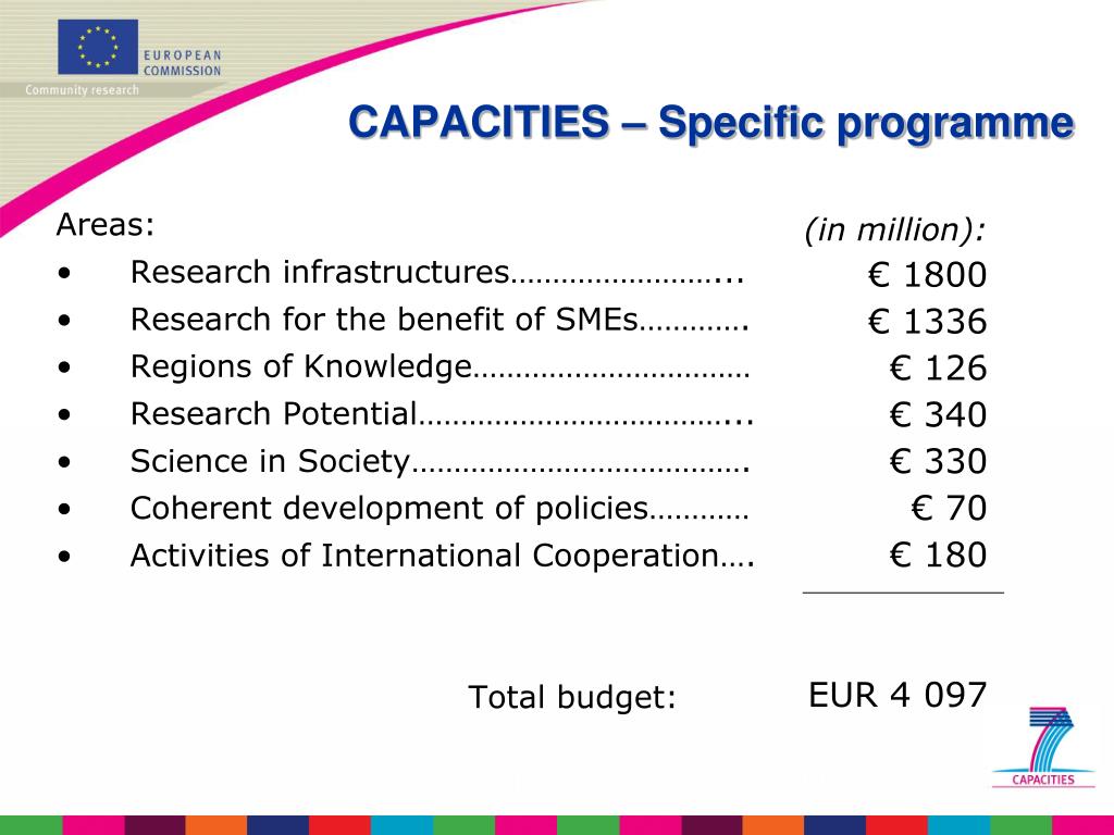 CAPACITIES – Specific programme Areas: • Research infrastructures……………………... • Research for the benefit of SMEs…………. • Regions of Knowledge…………………………… • Research Potential………………………………... • Science in Society…………………………………. • Coherent development of policies………… • Activities of International Cooperation…. Total budget: (in million): € 1800 € 1336 € 126 € 340 € 330 € 70 € 180 EUR 4 097