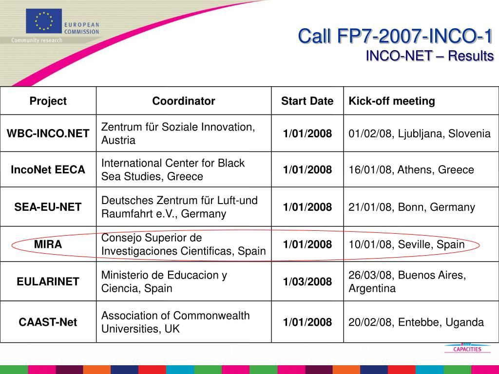 Project Coordinator Start Date Kick-off meeting WBC-INCO.NET Zentrum für Soziale Innovation, Austria 1/01/2008 01/02/08, Ljubljana, Slovenia IncoNet EECA International Center for Black Sea Studies, Greece 1/01/2008 16/01/08, Athens, Greece SEA-EU-NET Deutsches Zentrum für Luft-und Raumfahrt e.V., Germany 1/01/2008 21/01/08, Bonn, Germany MIRA Consejo Superior de Investigaciones Cientificas, Spain 1/01/2008 10/01/08, Seville, Spain EULARINET Ministerio de Educacion y Ciencia, Spain 1/03/2008 26/03/08, Buenos Aires, Argentina CAAST-Net Association of Commonwealth Universities, UK 1/01/2008 20/02/08, Entebbe, Uganda Call FP7-2007-INCO-1INCO-NET – Results