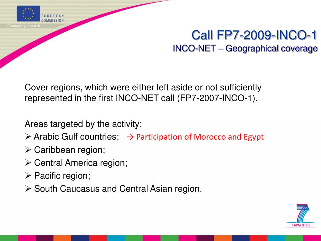 Call FP7-2009-INCO-1INCO-NET – Geographical coverage Cover regions, which were either left aside or not sufficiently represented in the first INCO-NET call (FP7-2007-INCO-1). Areas targeted by the activity: • Arabic Gulf countries; → Participation of Morocco and Egypt • Caribbean region; • Central America region; • Pacific region; • South Caucasus and Central Asian region.