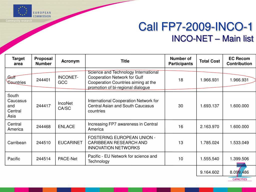 Target area Proposal Number Acronym Title Number of Participants Total Cost EC Recom Contribution Gulf Countries 244401 INCONET-GCC Science and Technology International Cooperation Network for Gulf Cooperation Countries aiming at the promotion of bi-regional dialogue 18 1.966.931 1.966.931 South Caucasus and Central Asia 244417 IncoNet CA/SC International Cooperation Network for Central Asian and South Caucasus countries 30 1.693.137 1.600.000 Central America 244468 ENLACE Increasing FP7 awareness in Central America 16 2.163.970 1.600.000 Carribean 244510 EUCARINET FOSTERING EUROPEAN UNION - CARIBBEAN RESEARCH AND INNOVATION NETWORKS 13 1.785.024 1.533.049 Pacific 244514 PACE-Net Pacific - EU Network for science and Technology 10 1.555.540 1.399.506 9.164.602 8.099.486 Call FP7-2009-INCO-1INCO-NET – Main list