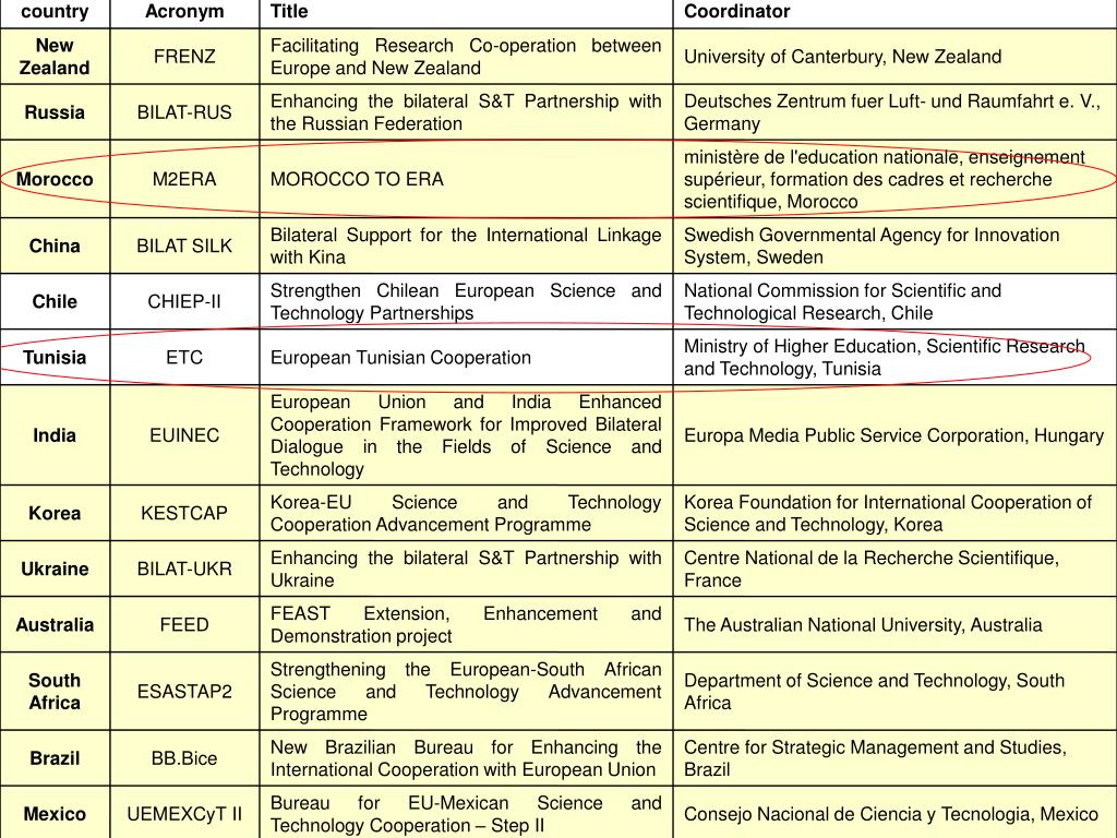 country Acronym Title Coordinator New Zealand FRENZ Facilitating Research Co-operation between Europe and New Zealand University of Canterbury, New Zealand Russia BILAT-RUS Enhancing the bilateral S&T Partnership with the Russian Federation Deutsches Zentrum fuer Luft- und Raumfahrt e. V., Germany Morocco M2ERA MOROCCO TO ERA ministère de l'education nationale, enseignement supérieur, formation des cadres et recherche scientifique, Morocco China BILAT SILK Bilateral Support for the International Linkage with Kina Swedish Governmental Agency for Innovation System, Sweden Chile CHIEP-II Strengthen Chilean European Science and Technology Partnerships National Commission for Scientific and Technological Research, Chile Tunisia ETC European Tunisian Cooperation Ministry of Higher Education, Scientific Research and Technology, Tunisia India EUINEC European Union and India Enhanced Cooperation Framework for Improved Bilateral Dialogue in the Fields of Science and Technology Europa Media Public Service Corporation, Hungary Korea KESTCAP Korea-EU Science and Technology Cooperation Advancement Programme Korea Foundation for International Cooperation of Science and Technology, Korea Ukraine BILAT-UKR Enhancing the bilateral S&T Partnership with Ukraine Centre National de la Recherche Scientifique, France Australia FEED FEAST Extension, Enhancement and Demonstration project The Australian National University, Australia South Africa ESASTAP2 Strengthening the European-South African Science and Technology Advancement Programme Department of Science and Technology, South Africa Brazil BB.Bice New Brazilian Bureau for Enhancing the International Cooperation with European Union Centre for Strategic Management and Studies, Brazil Mexico UEMEXCyT II Bureau for EU-Mexican Science and Technology Cooperation – Step II Consejo Nacional de Ciencia y Tecnologia, Mexico