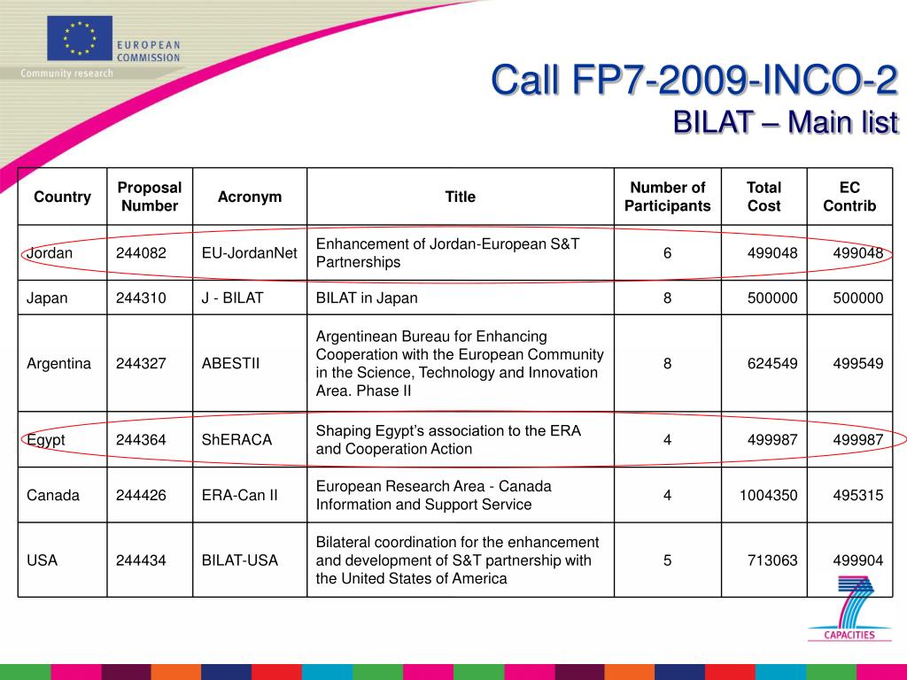 LAM ASIA Africa - MPC EECA Industrialised countries Argentina China Egypt Russia Australia Brazil India Morocco Ukraine Canada Chile South Africa Japan Mexico Tunisia South Korea Jordan New Zealand USA Call FP7-2009-INCO-2BILAT – Country coverage 13 countries covered by the first BILAT call 6 countries targeted by the second call