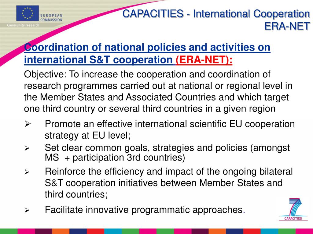 CAPACITIES - International CooperationERA-NET Coordination of national policies and activities on international S&T cooperation(ERA-NET): Objective: To increase the cooperation and coordination of research programmes carried out at national or regional level in the Member States and Associated Countries and which target one third country or several third countries in a given region • Promote an effective international scientific EU cooperation strategy at EU level; • Set clear common goals, strategies and policies (amongst MS + participation 3rd countries) • Reinforce the efficiency and impact of the ongoing bilateral S&T cooperation initiatives between Member States and third countries; • Facilitate innovative programmatic approaches.