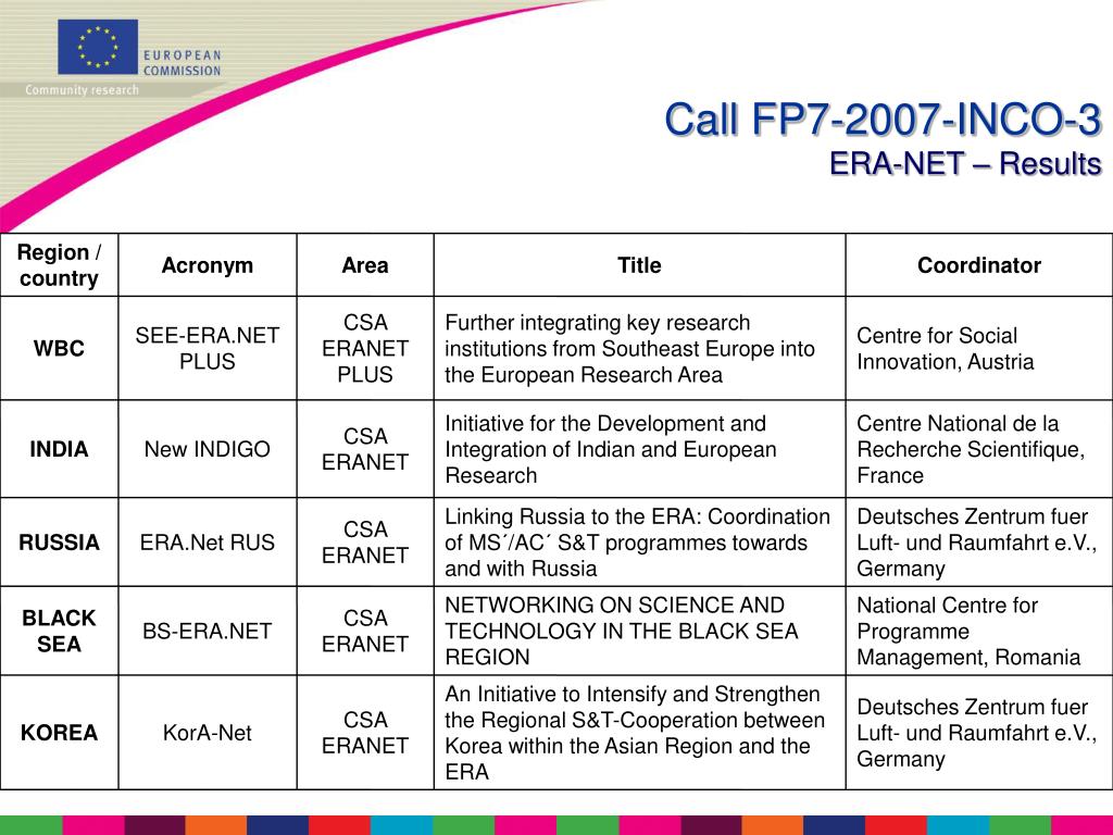 Region / country Acronym Area Title Coordinator WBC SEE-ERA.NET PLUS CSA ERANET PLUS Further integrating key research institutions from Southeast Europe into the European Research Area Centre for Social Innovation, Austria INDIA New INDIGO CSA ERANET Initiative for the Development and Integration of Indian and European Research Centre National de la Recherche Scientifique, France RUSSIA ERA.Net RUS CSA ERANET Linking Russia to the ERA: Coordination of MS´/AC´ S&T programmes towards and with Russia Deutsches Zentrum fuer Luft- und Raumfahrt e.V., Germany BLACK SEA BS-ERA.NET CSA ERANET NETWORKING ON SCIENCE AND TECHNOLOGY IN THE BLACK SEA REGION National Centre for Programme Management, Romania KOREA KorA-Net CSA ERANET An Initiative to Intensify and Strengthen the Regional S&T-Cooperation between Korea within the Asian Region and the ERA Deutsches Zentrum fuer Luft- und Raumfahrt e.V., Germany Call FP7-2007-INCO-3ERA-NET – Results