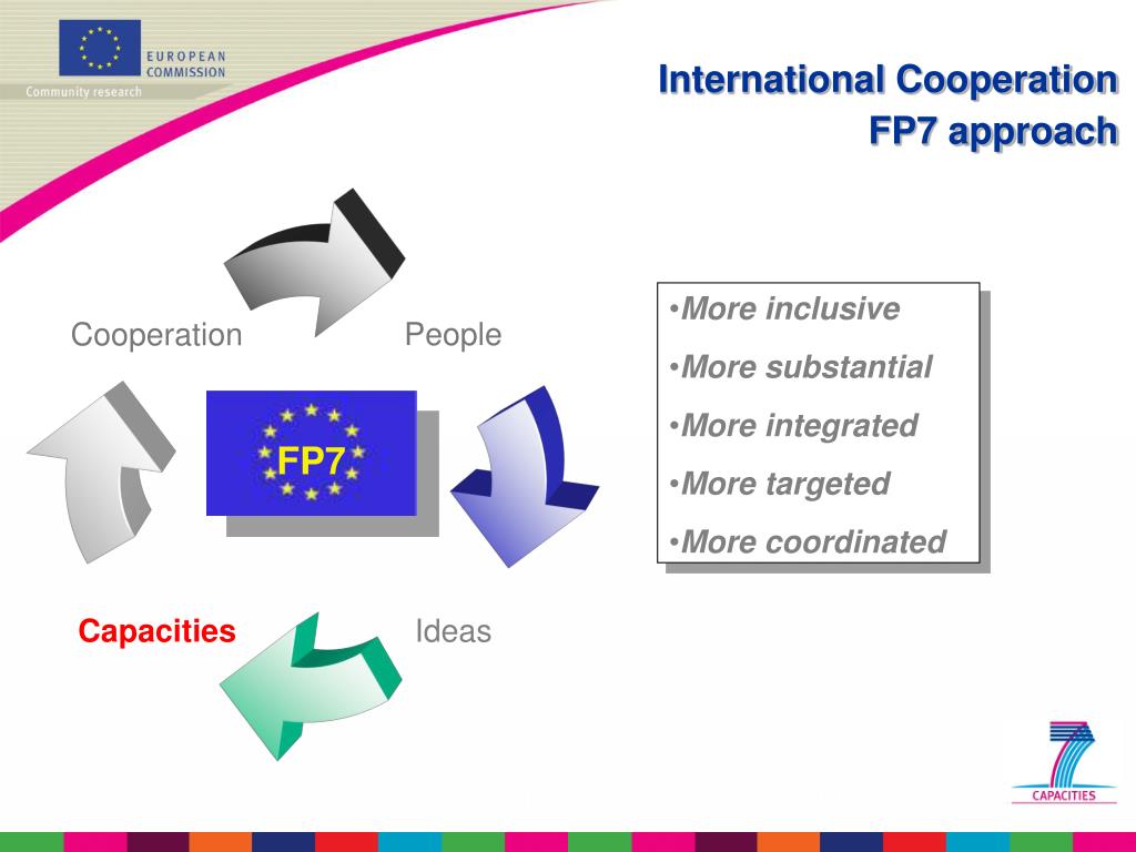 People Cooperation FP7 Ideas Capacities International CooperationFP7 approach • More inclusive • More substantial • More integrated • More targeted • More coordinated