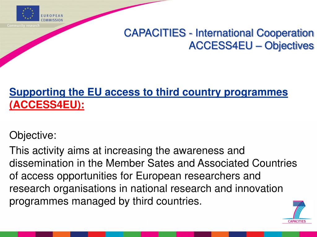 CAPACITIES - International CooperationACCESS4EU – Objectives Supporting the EU access to third country programmes(ACCESS4EU): Objective: This activity aims at increasing the awareness and dissemination in the Member Sates and Associated Countries of access opportunities for European researchers and research organisations in national research and innovation programmes managed by third countries.