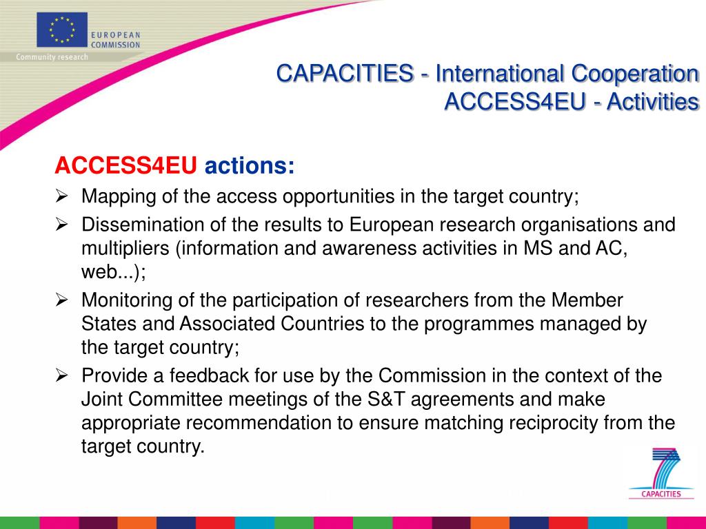 CAPACITIES - International CooperationACCESS4EU - Activities ACCESS4EU actions: • Mapping of the access opportunities in the target country; • Dissemination of the results to European research organisations and multipliers (information and awareness activities in MS and AC, web...); • Monitoring of the participation of researchers from the Member States and Associated Countries to the programmes managed by the target country; • Provide a feedback for use by the Commission in the context of the Joint Committee meetings of the S&T agreements and make appropriate recommendation to ensure matching reciprocity from the target country.