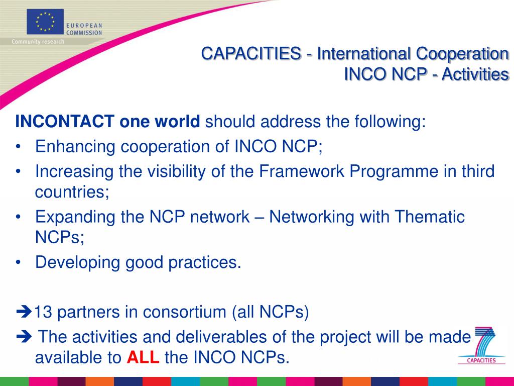 CAPACITIES - International CooperationINCO NCP - Activities INCONTACT one world should address the following: • Enhancing cooperation of INCO NCP; • Increasing the visibility of the Framework Programme in third countries; • Expanding the NCP network – Networking with Thematic NCPs; • Developing good practices. 13 partners in consortium (all NCPs) The activities and deliverables of the project will be made available to ALL the INCO NCPs.