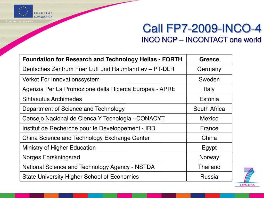 Foundation for Research and Technology Hellas - FORTH Greece Deutsches Zentrum Fuer Luft und Raumfahrt ev – PT-DLR Germany Verket For Innovationssystem Sweden Agenzia Per La Promozione della Ricerca Europea - APRE Italy Sihtasutus Archimedes Estonia Department of Science and Technology South Africa Consejo Nacional de Cienca Y Tecnologia - CONACYT Mexico Institut de Recherche pour le Developpement - IRD France China Science and Technology Exchange Center China Ministry of Higher Education Egypt Norges Forskningsrad Norway National Science and Technology Agency - NSTDA Thailand State University Higher School of Economics Russia Call FP7-2009-INCO-4INCO NCP – INCONTACT one world