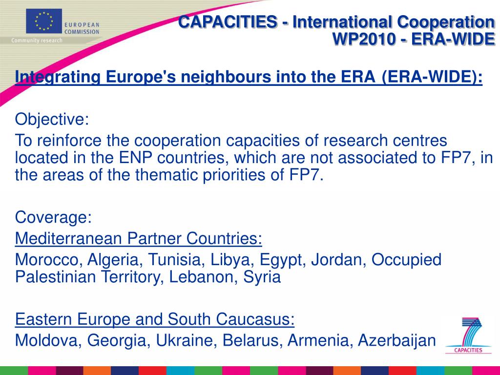 CAPACITIES - International CooperationWP2010 - ERA-WIDE Integrating Europe's neighbours into the ERA(ERA-WIDE): Objective: To reinforce the cooperation capacities of research centres located in the ENP countries, which are not associated to FP7, in the areas of the thematic priorities of FP7. Coverage: Mediterranean Partner Countries: Morocco, Algeria, Tunisia, Libya, Egypt, Jordan, Occupied Palestinian Territory, Lebanon, Syria Eastern Europe and South Caucasus: Moldova, Georgia, Ukraine, Belarus, Armenia, Azerbaijan