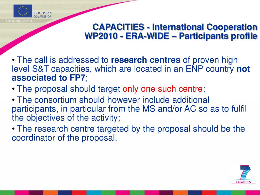 CAPACITIES - International CooperationWP2010 - ERA-WIDE – Participants profile • The call is addressed to research centres of proven high level S&T capacities, which are located in an ENP country not associated to FP7; • The proposal should target only one such centre; • The consortium should however include additional participants, in particular from the MS and/or AC so as to fulfil the objectives of the activity; • The research centre targeted by the proposal should be the coordinator of the proposal.