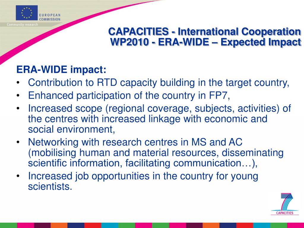 CAPACITIES - International CooperationWP2010 - ERA-WIDE – Expected Impact • ERA-WIDE impact: • Contribution to RTD capacity building in the target country, • Enhanced participation of the country in FP7, • Increased scope (regional coverage, subjects, activities) of the centres with increased linkage with economic and social environment, • Networking with research centres in MS and AC (mobilising human and material resources, disseminating scientific information, facilitating communication…), • Increased job opportunities in the country for young scientists.