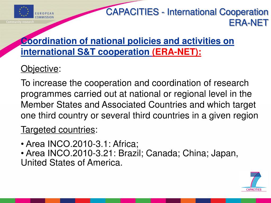 CAPACITIES - International CooperationERA-NET Coordination of national policies and activities on international S&T cooperation(ERA-NET): Objective: To increase the cooperation and coordination of research programmes carried out at national or regional level in the Member States and Associated Countries and which target one third country or several third countries in a given region Targeted countries: • Area INCO.2010-3.1: Africa; • Area INCO.2010-3.21: Brazil; Canada; China; Japan, United States of America.