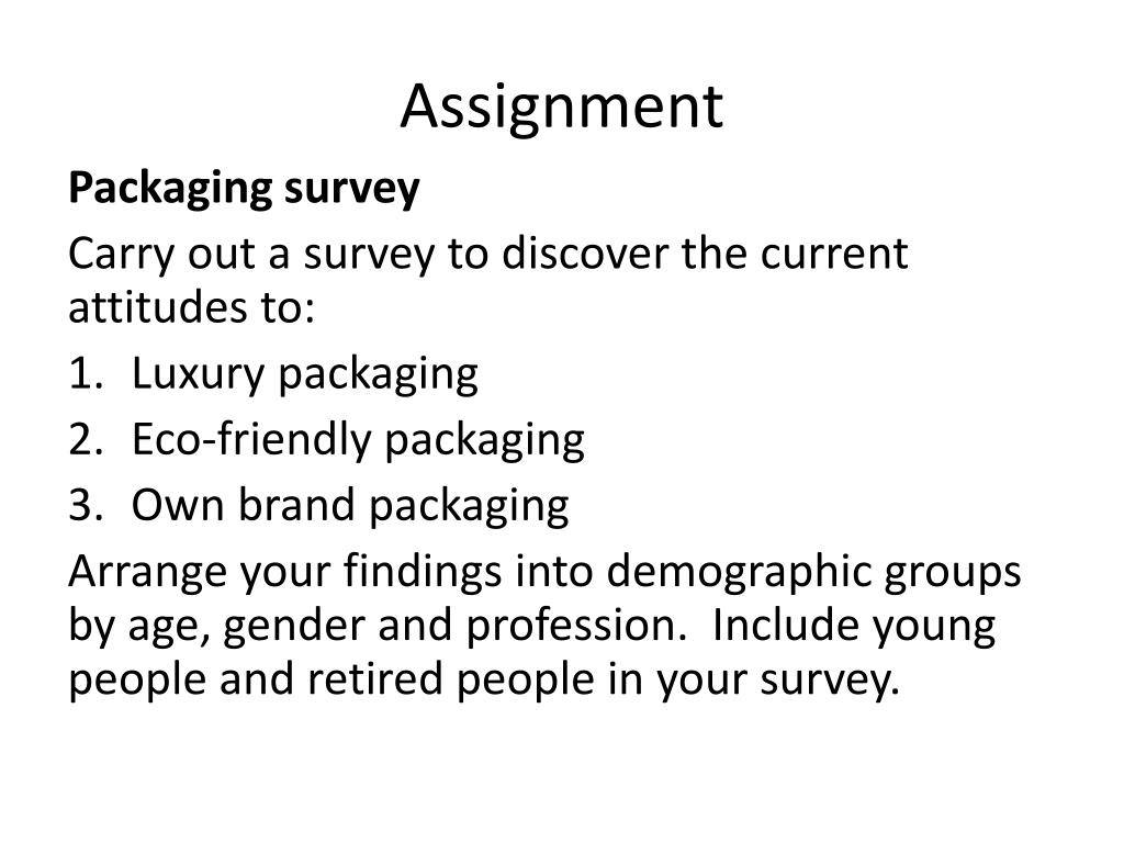 Assignment Packaging survey Carry out a survey to discover the current attitudes to: • Luxury packaging • Eco-friendly packaging • Own brand packaging Arrange your findings into demographic groups by age, gender and profession. Include young people and retired people in your survey.