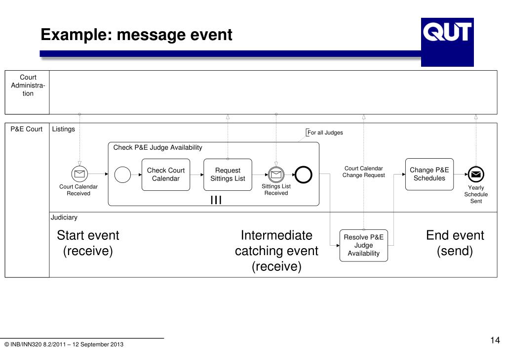 Example: message event Start event (receive) Intermediate catching event (receive) End event (send)
