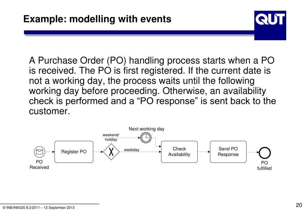 Example: modelling with events A Purchase Order (PO) handling process starts when a PO is received. The PO is first registered. If the current date is not a working day, the process waits until the following working day before proceeding. Otherwise, an availability check is performed and a “PO response” is sent back to the customer.
