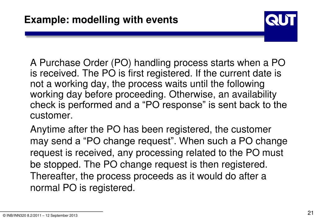 Example: modelling with events A Purchase Order (PO) handling process starts when a PO is received. The PO is first registered. If the current date is not a working day, the process waits until the following working day before proceeding. Otherwise, an availability check is performed and a “PO response” is sent back to the customer. Anytime after the PO has been registered, the customer may send a “PO change request”. When such a PO change request is received, any processing related to the PO must be stopped. The PO change request is then registered. Thereafter, the process proceeds as it would do after a normal PO is registered.