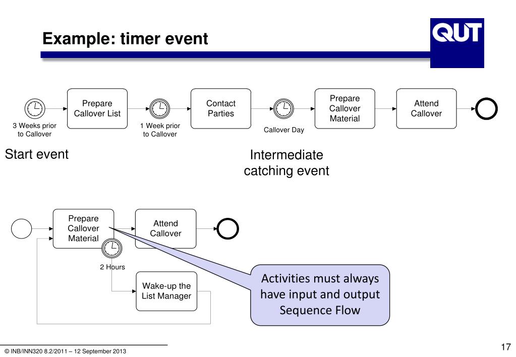 Example: timer event Start event Intermediate catching event Activities must always have input and output Sequence Flow