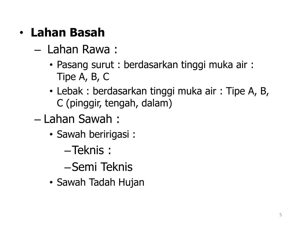 Lahan Basah • Lahan Rawa : • Pasang surut : berdasarkan tinggi muka air : Tipe A, B, C • Lebak : berdasarkan tinggi muka air : Tipe A, B, C (pinggir, tengah, dalam) • Lahan Sawah : • Sawah beririgasi : • Teknis : • Semi Teknis • Sawah Tadah Hujan