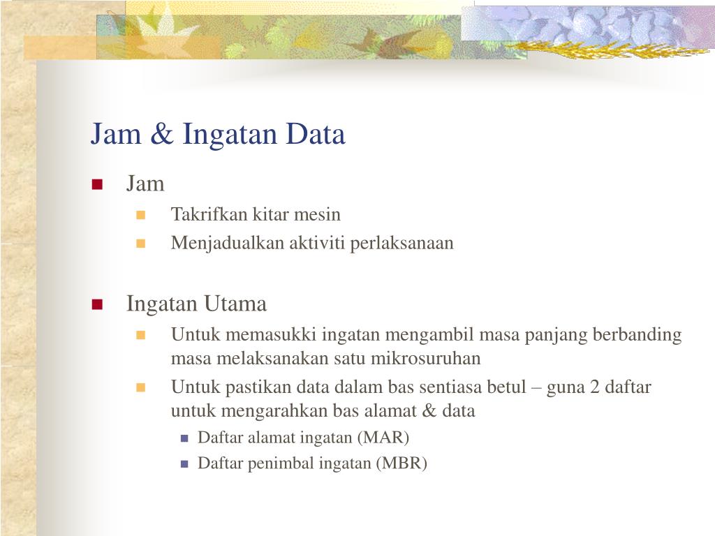 Jam & Ingatan Data • Jam • Takrifkan kitar mesin • Menjadualkan aktiviti perlaksanaan • Ingatan Utama • Untuk memasukki ingatan mengambil masa panjang berbanding masa melaksanakan satu mikrosuruhan • Untuk pastikan data dalam bas sentiasa betul – guna 2 daftar untuk mengarahkan bas alamat & data • Daftar alamat ingatan (MAR) • Daftar penimbal ingatan (MBR)