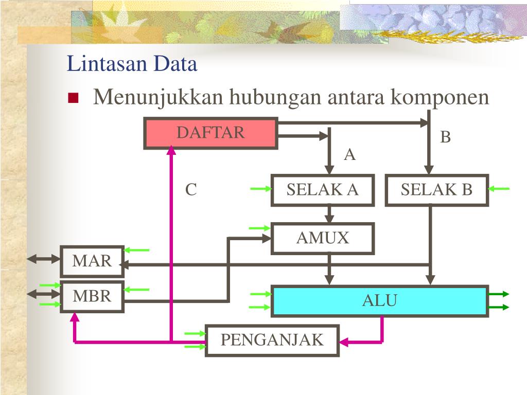 DAFTAR SELAK A SELAK B AMUX MAR MBR ALU PENGANJAK Lintasan Data • Menunjukkan hubungan antara komponen B A C