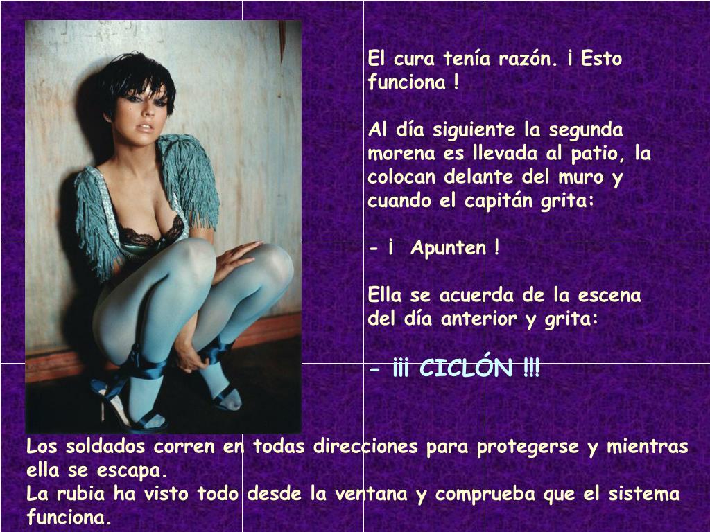El cura tenía razón. ¡ Esto funciona ! Al día siguiente la segunda morena es llevada al patio, la colocan delante del muro y cuando el capitán grita: - ¡ Apunten ! Ella se acuerda de la escena del día anterior y grita: - ¡¡¡ CICLÓN !!! Los soldados corren en todas direcciones para protegerse y mientras ella se escapa. La rubia ha visto todo desde la ventana y comprueba que el sistema funciona.