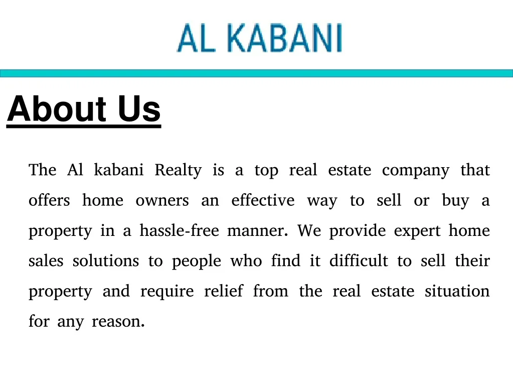About Us The Al kabani Realty is a top real estate company that offers home owners an effective way to sell or buy a property in a hassle-free manner. We provide expert home sales solutions to people who find it difficult to sell their property and require relief from the real estate situation for any reason.