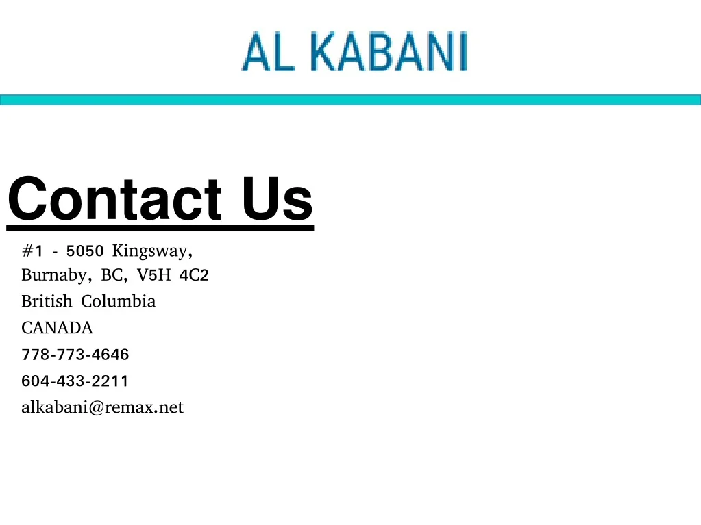 Contact Us #1 - 5050 Kingsway, Burnaby, BC, V5H 4C2 British Columbia CANADA 778-773-4646 604-433-2211 alkabani@remax.net