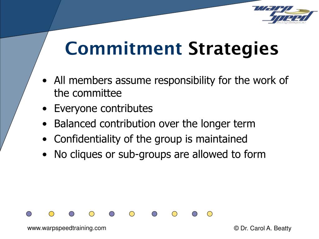 Commitment Strategies • All members assume responsibility for the work of the committee • Everyone contributes • Balanced contribution over the longer term • Confidentiality of the group is maintained • No cliques or sub-groups are allowed to form