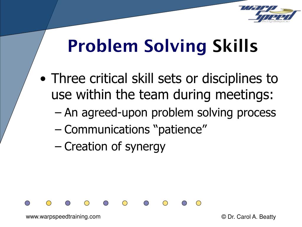 Problem Solving Skills • Three critical skill sets or disciplines to use within the team during meetings: • An agreed-upon problem solving process • Communications “patience” • Creation of synergy