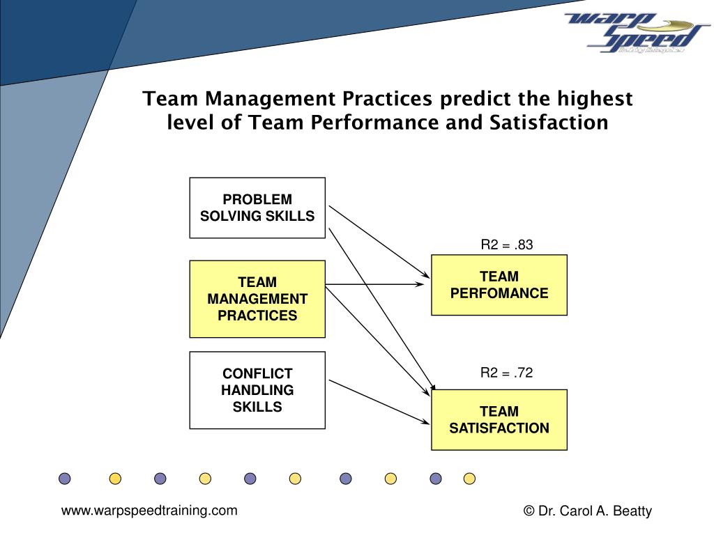 Team Management Practices predict the highest level of Team Performance and Satisfaction PROBLEM SOLVING SKILLS R2 = .83 TEAM PERFOMANCE TEAM MANAGEMENT PRACTICES CONFLICT HANDLING SKILLS R2 = .72 TEAM SATISFACTION
