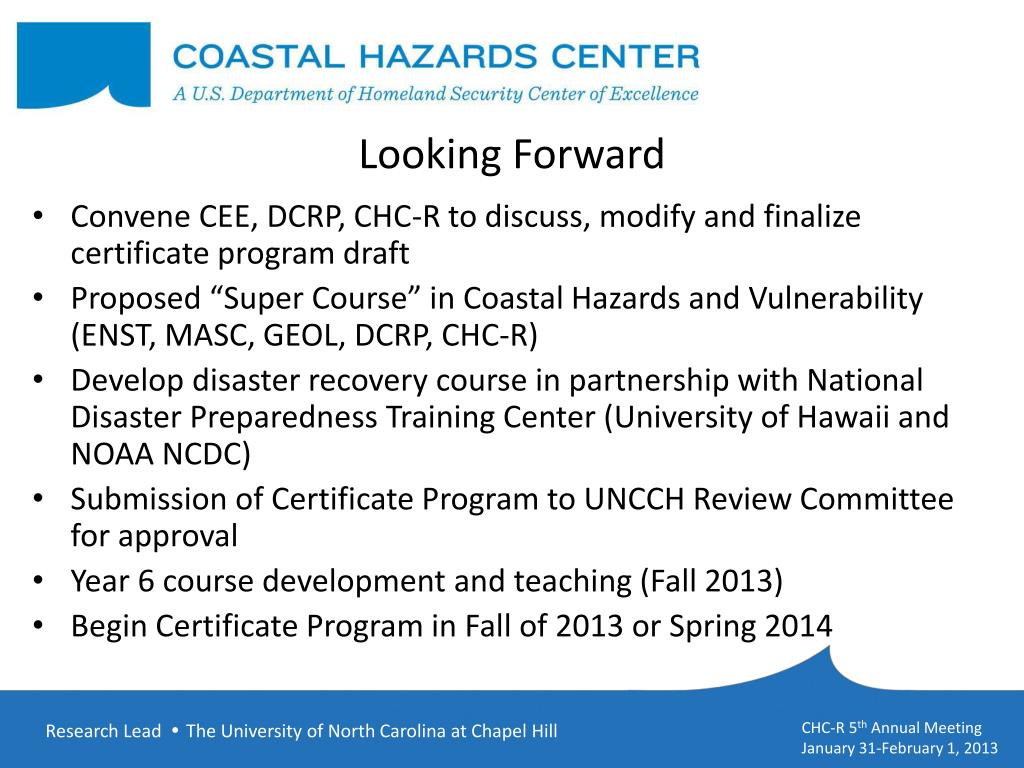 Looking Forward • Convene CEE, DCRP, CHC-R to discuss, modify and finalize certificate program draft • Proposed “Super Course” in Coastal Hazards and Vulnerability (ENST, MASC, GEOL, DCRP, CHC-R) • Develop disaster recovery course in partnership with National Disaster Preparedness Training Center (University of Hawaii and NOAA NCDC) • Submission of Certificate Program to UNCCH Review Committee for approval • Year 6 course development and teaching (Fall 2013) • Begin Certificate Program in Fall of 2013 or Spring 2014