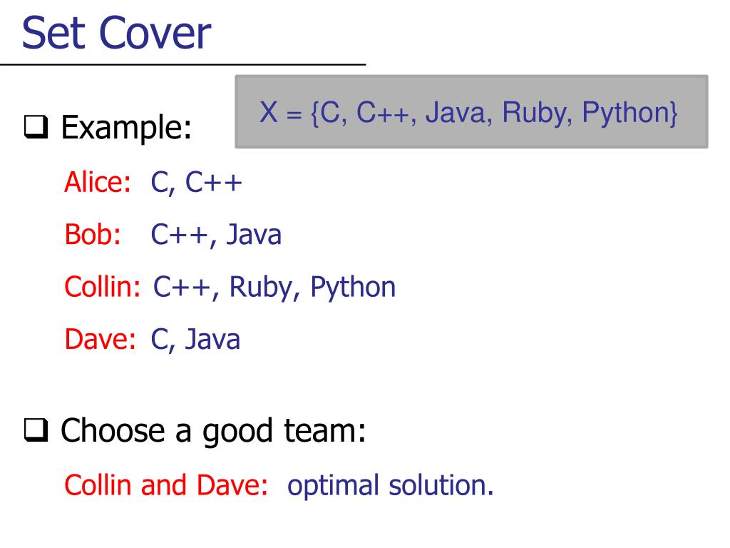 Set Cover X = {C, C++, Java, Ruby, Python} • Example: Alice: C, C++ Bob:C++, Java Collin:C++, Ruby, Python Dave:C, Java • Choose a good team: Collin and Dave: optimal solution.