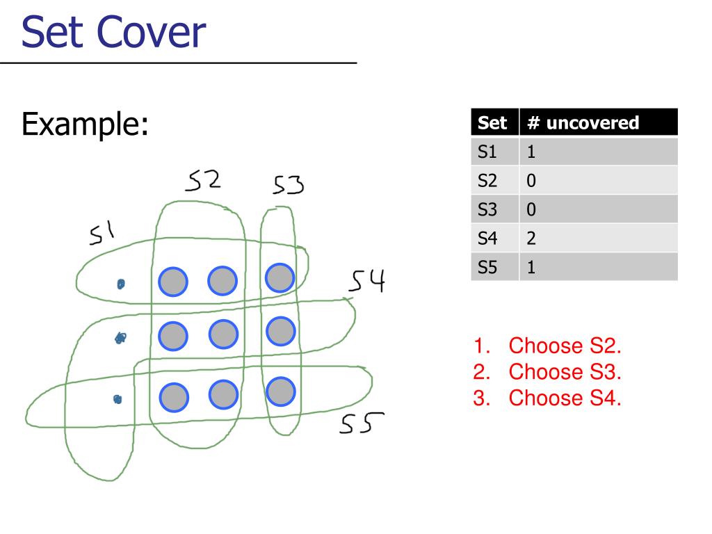 Set Cover Example: Choose S2. Choose S3. Choose S4.