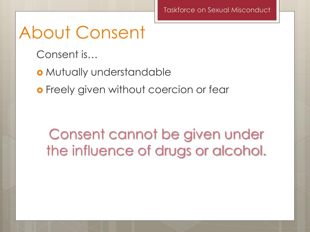 Taskforce on Sexual Misconduct About Consent Consent is… • Mutually understandable • Freely given without coercion or fear Consent cannot be given under the influence of drugs or alcohol.