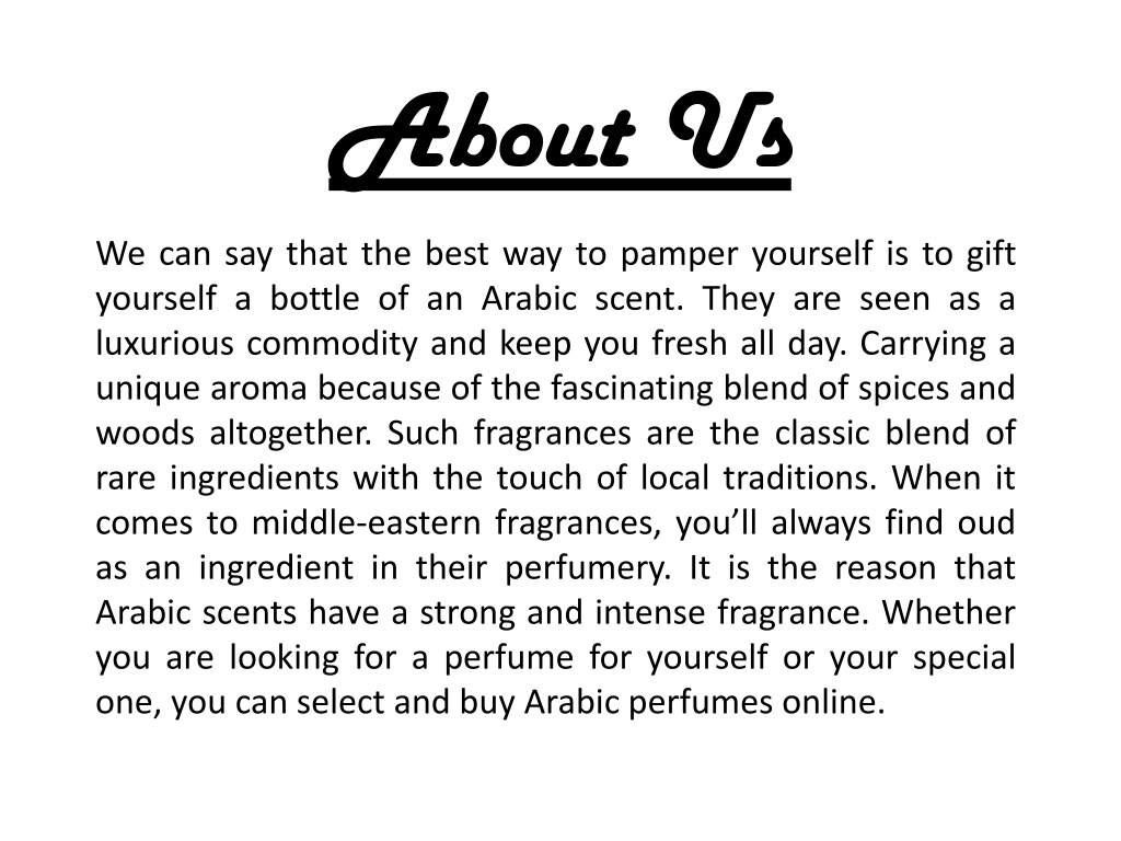 About Us We can say that the best way to pamper yourself is to gift yourself a bottle of an Arabic scent. They are seen as a luxurious commodity and keep you fresh all day. Carrying a unique aroma because of the fascinating blend of spices and woods altogether. Such fragrances are the classic blend of rare ingredients with the touch of local traditions. When it comes to middle-eastern fragrances, you’ll always find oud as an ingredient in their perfumery. It is the reason that Arabic scents have a strong and intense fragrance. Whether you are looking for a perfume for yourself or your special one, you can select and buy Arabic perfumes online.