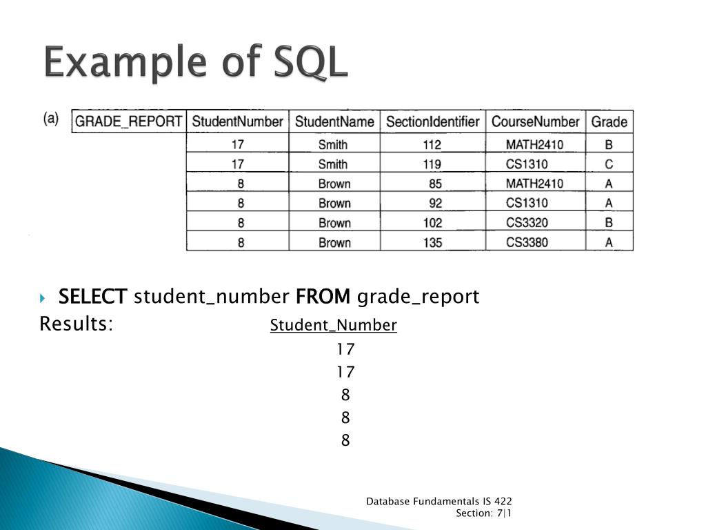 Example of SQL • SELECTstudent_numberFROMgrade_report Results: Student_Number 17 17 8 8 8 Database Fundamentals IS 422 Section: 7|1