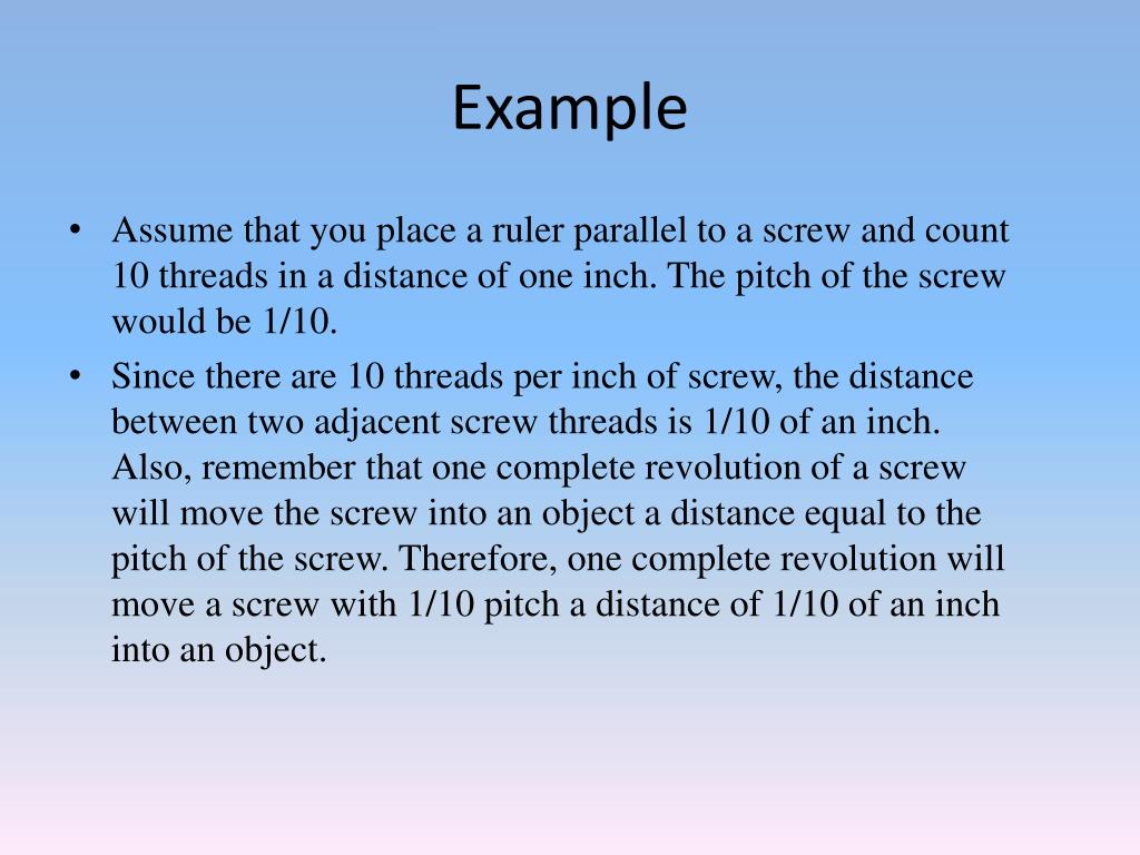 Example • Assume that you place a ruler parallel to a screw and count 10 threads in a distance of one inch. The pitch of the screw would be 1/10. • Since there are 10 threads per inch of screw, the distance between two adjacent screw threads is 1/10 of an inch. Also, remember that one complete revolution of a screw will move the screw into an object a distance equal to the pitch of the screw. Therefore, one complete revolution will move a screw with 1/10 pitch a distance of 1/10 of an inch into an object.