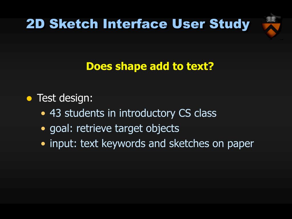 2D Sketch Interface User Study Does shape add to text? • Test design: • 43 students in introductory CS class • goal: retrieve target objects • input: text keywords and sketches on paper