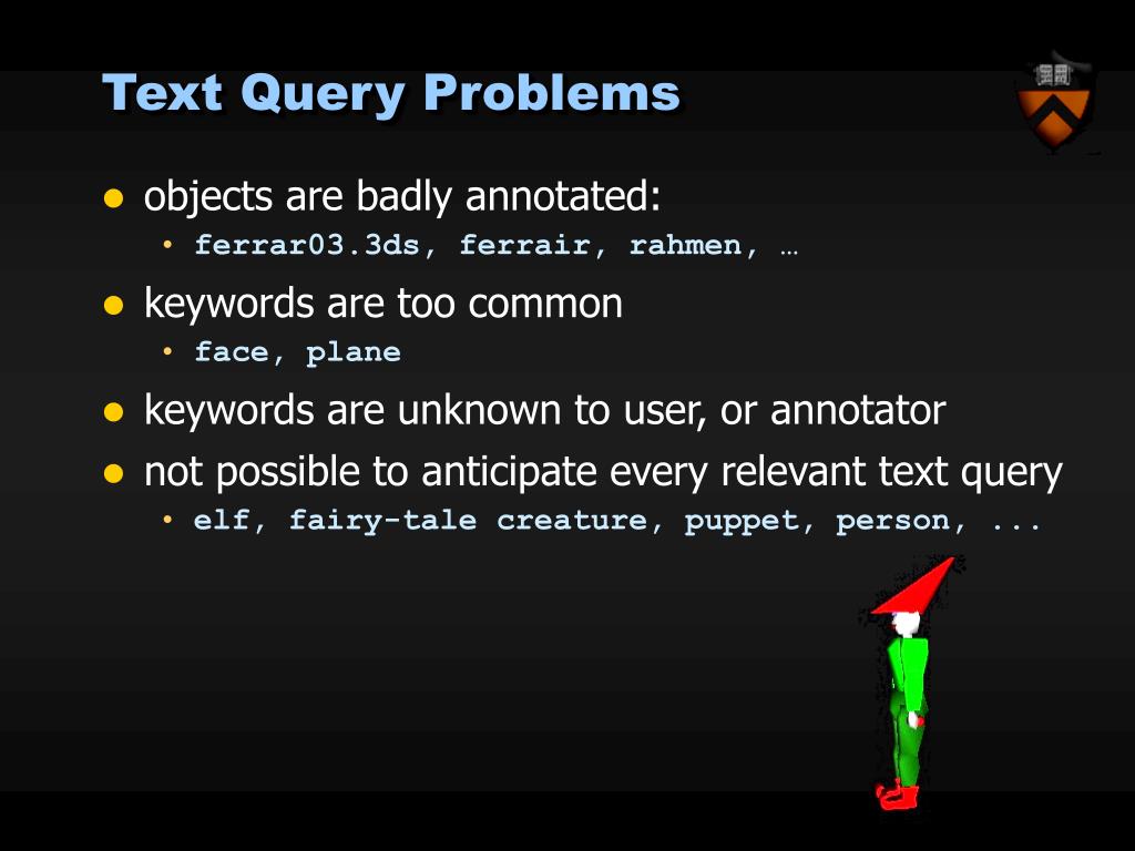 Text Query Problems • objects are badly annotated: • ferrar03.3ds, ferrair, rahmen, … • keywords are too common • face, plane • keywords are unknown to user, or annotator • not possible to anticipate every relevant text query • elf, fairy-tale creature, puppet, person, ...