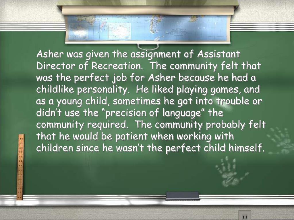 Asher was given the assignment of Assistant Director of Recreation. The community felt that was the perfect job for Asher because he had a childlike personality. He liked playing games, and as a young child, sometimes he got into trouble or didn’t use the “precision of language” the community required. The community probably felt that he would be patient when working with children since he wasn’t the perfect child himself.