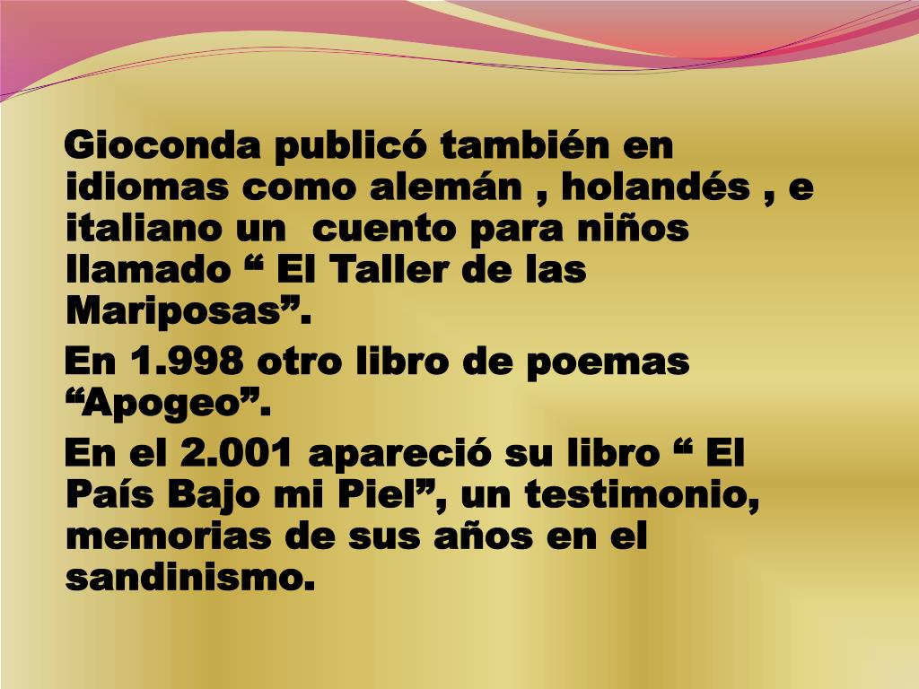 Gioconda publicó también en idiomas como alemán , holandés , e italiano un cuento para niños llamado “ El Taller de las Mariposas”. En 1.998 otro libro de poemas “Apogeo”. En el 2.001 apareció su libro “ El País Bajo mi Piel”, un testimonio, memorias de sus años en el sandinismo.