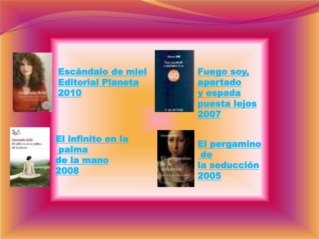 Escándalo de mielEditorial Planeta2010 Fuego soy, apartado y espadapuesta lejos2007 El infinito en la palma de la mano2008 El pergamino de la seducción2005