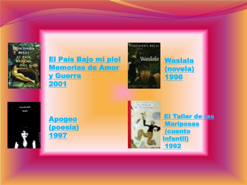 Waslala(novela) 1996 El País Bajo mi piel Memorias de Amor y Guerra2001 El Taller de las Mariposas (cuento infantil) 1992 Apogeo(poesía) 1997