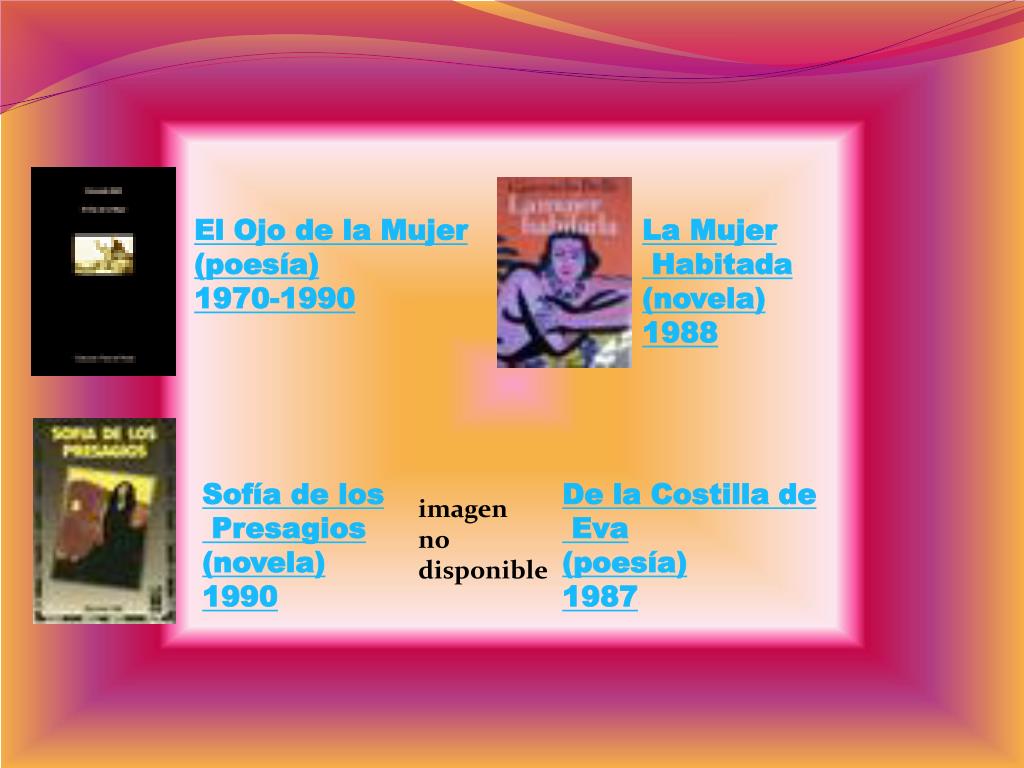 El Ojo de la Mujer(poesía)1970-1990 La Mujer Habitada(novela)1988 Sofía de los Presagios(novela)1990 De la Costilla de Eva(poesía)1987 imagennodisponible