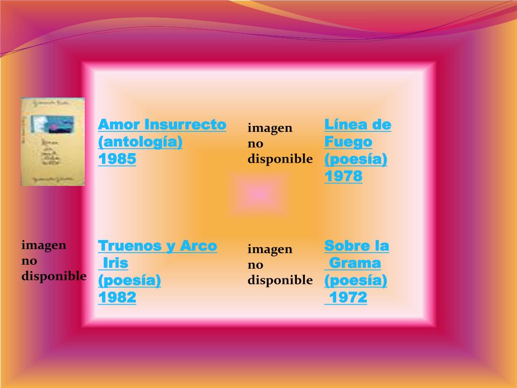 Amor Insurrecto(antología)1985 Línea de Fuego(poesía)1978 imagennodisponible imagennodisponible Truenos y Arco Iris(poesía)1982 Sobre la Grama(poesía) 1972 imagennodisponible
