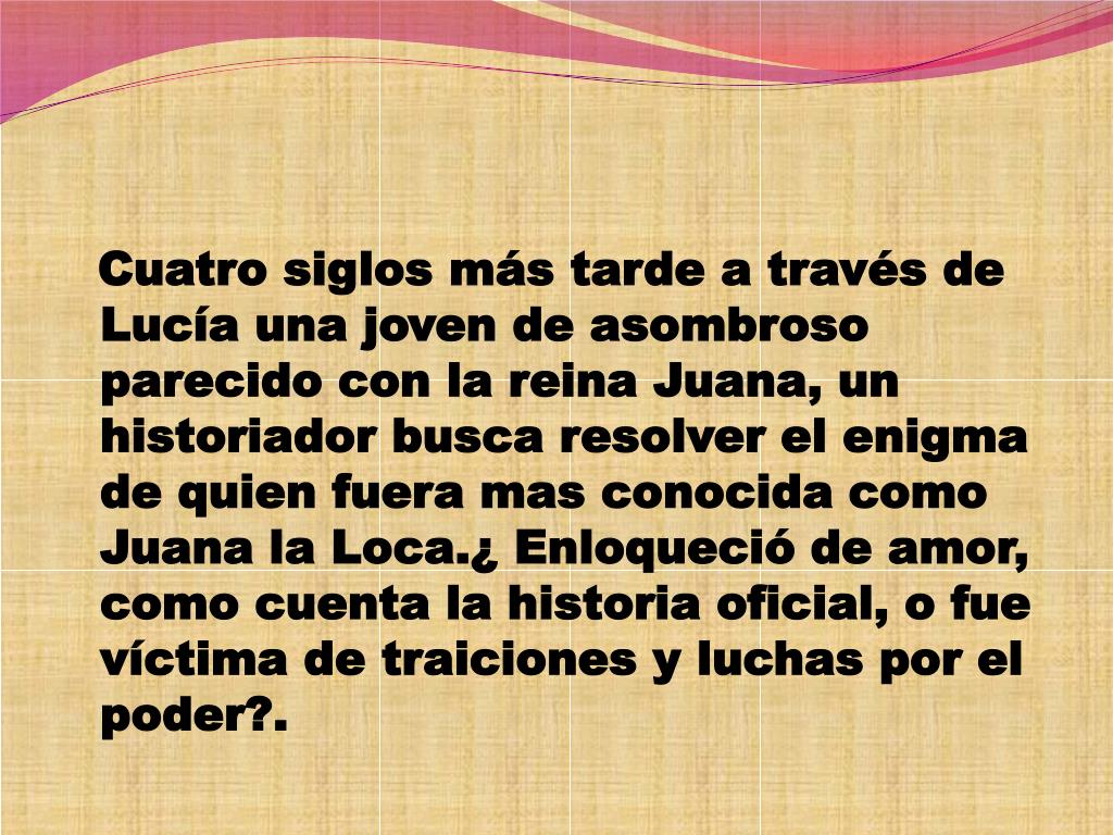 Cuatro siglos más tarde a través de Lucía una joven de asombroso parecido con la reina Juana, un historiador busca resolver el enigma de quien fuera mas conocida como Juana la Loca.¿ Enloqueció de amor, como cuenta la historia oficial, o fue víctima de traiciones y luchas por el poder?.